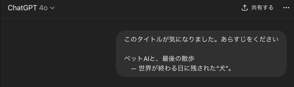 という訳で短編小説を「GPT4o」に作ってもらいます。(ちなみに小説は詳しくないです)